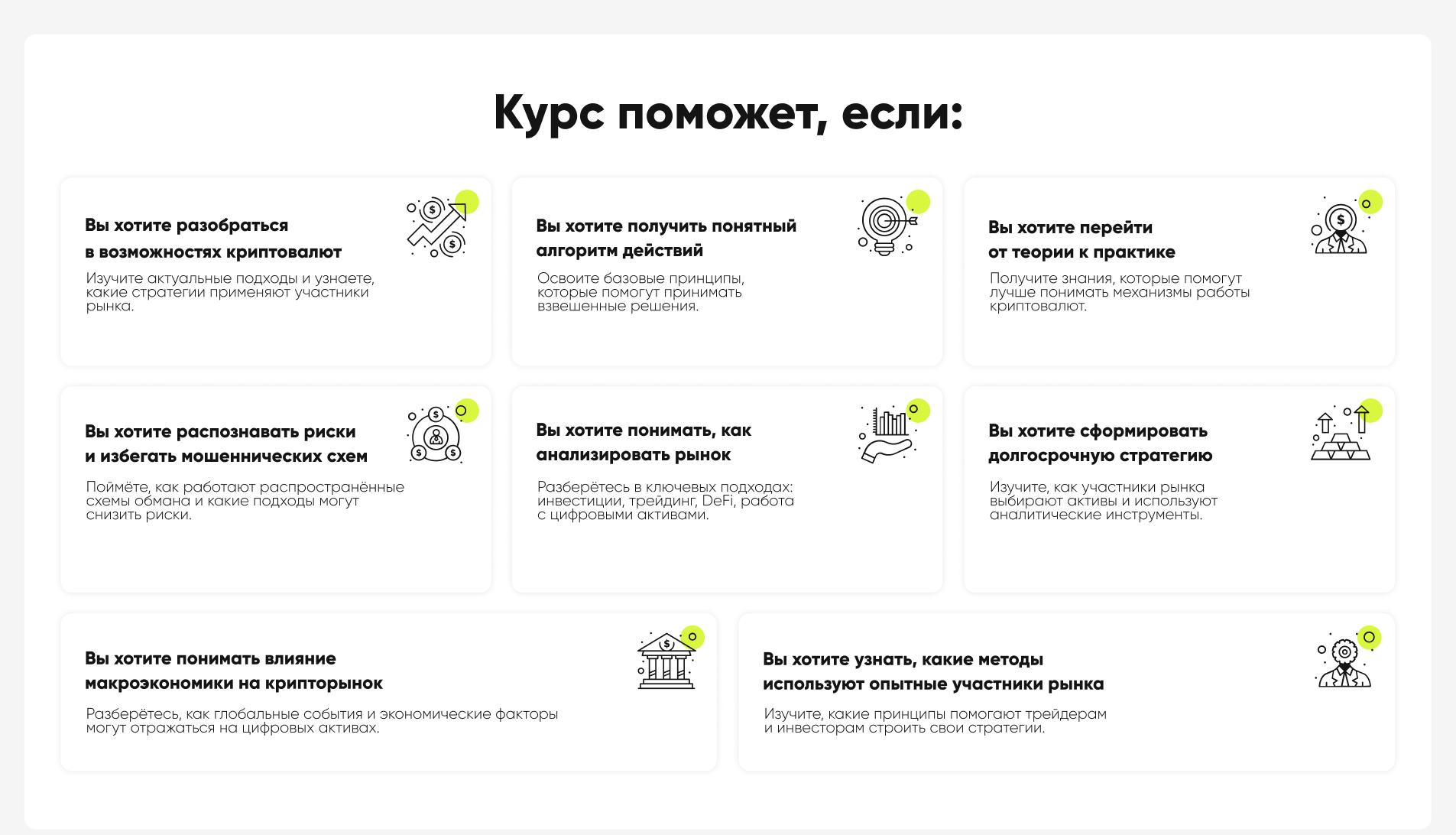 - Обучает анализу и пониманию крипторынка.